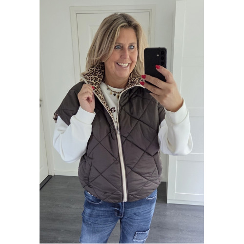 Tags: BODYWARMER bruin/panter, reversibel, past tm maat 42, VESTEN & JASJES